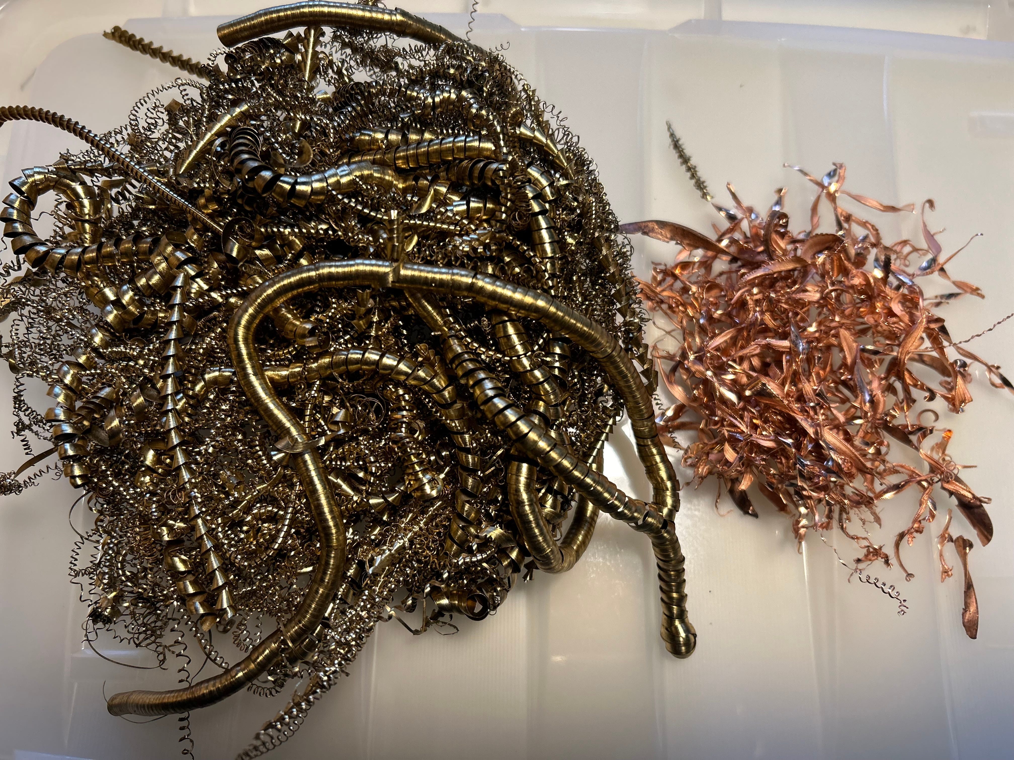 At a rock shop, I found quartz crystals, a locksmith provided metal shavings — and later, I found more interesting shavings online. The finer shavings are great, but I like the larger shavings too for esthetics.