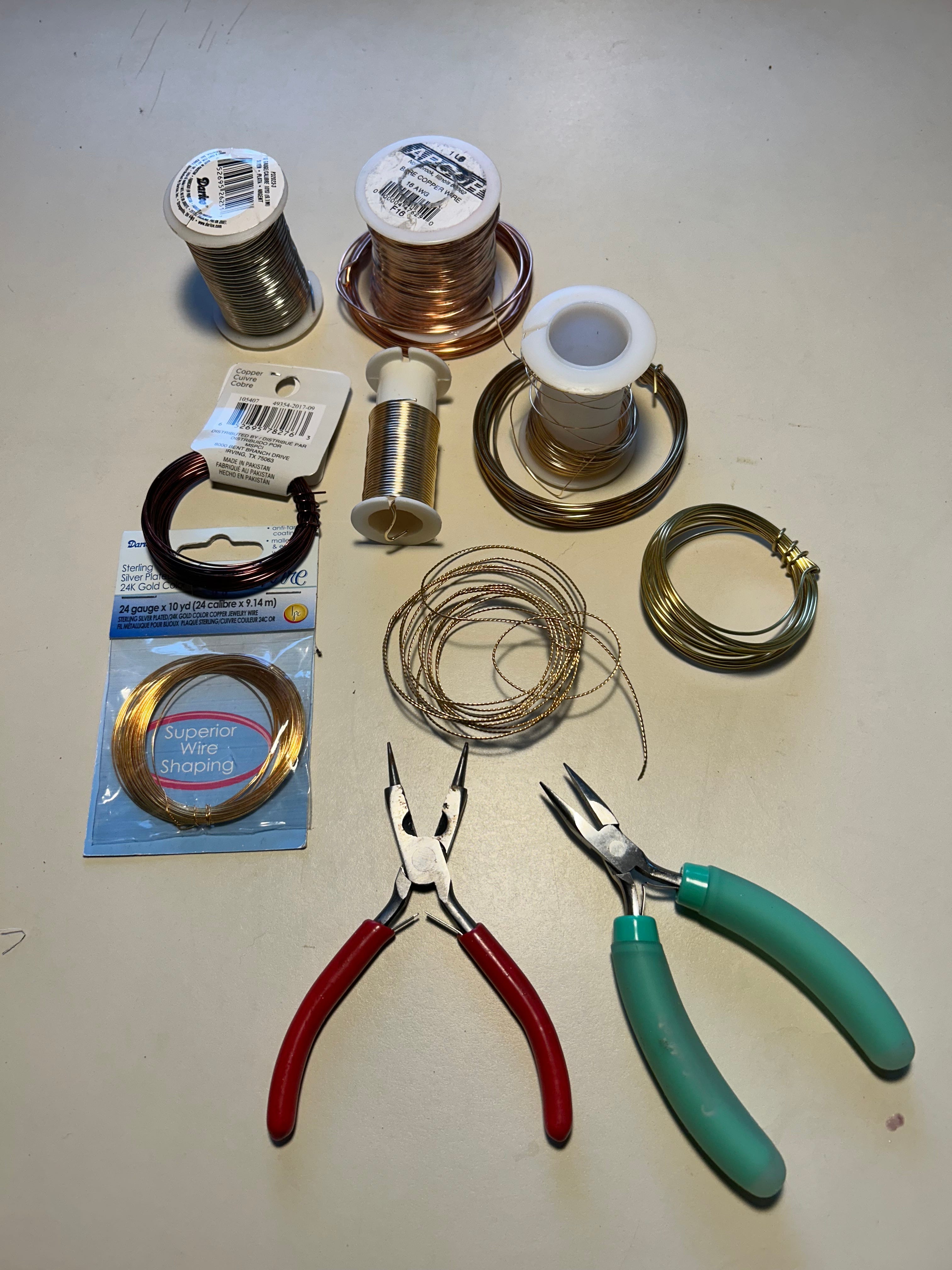 The craft section of JoAnn’s Fabrics or Michael’s provided different gauges of copper wire for making coils. Amazon sometimes has great prices. I found tools for wire work, along with epoxy resin and I was in business.