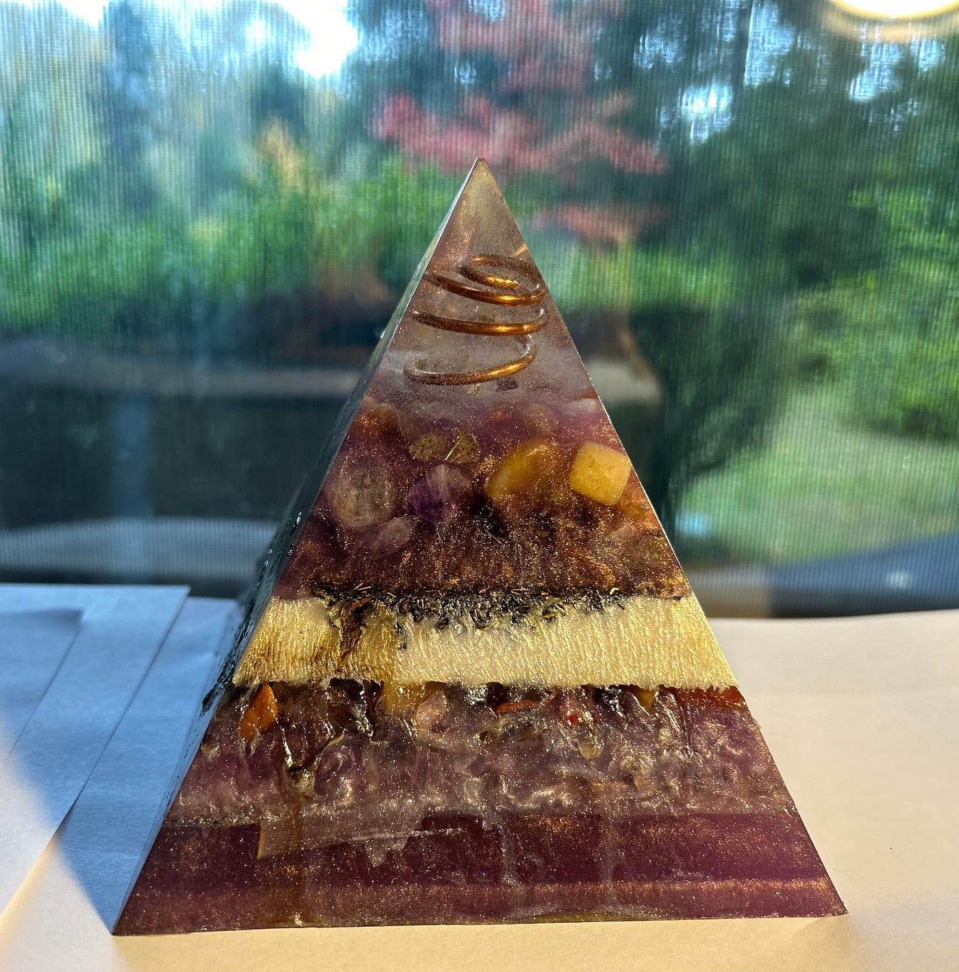 After working with the basics, I learned about the properties of different gemstones and added things like shungite, citrine, peridot, lapis, turquoise, bloodstone, amethyst and pyrite. I generally did a capstone of apophyllite, a beautiful and powerful stone for clearing negative energy. Selenite has a celestial energy and I used it in just about all of my pyramids.